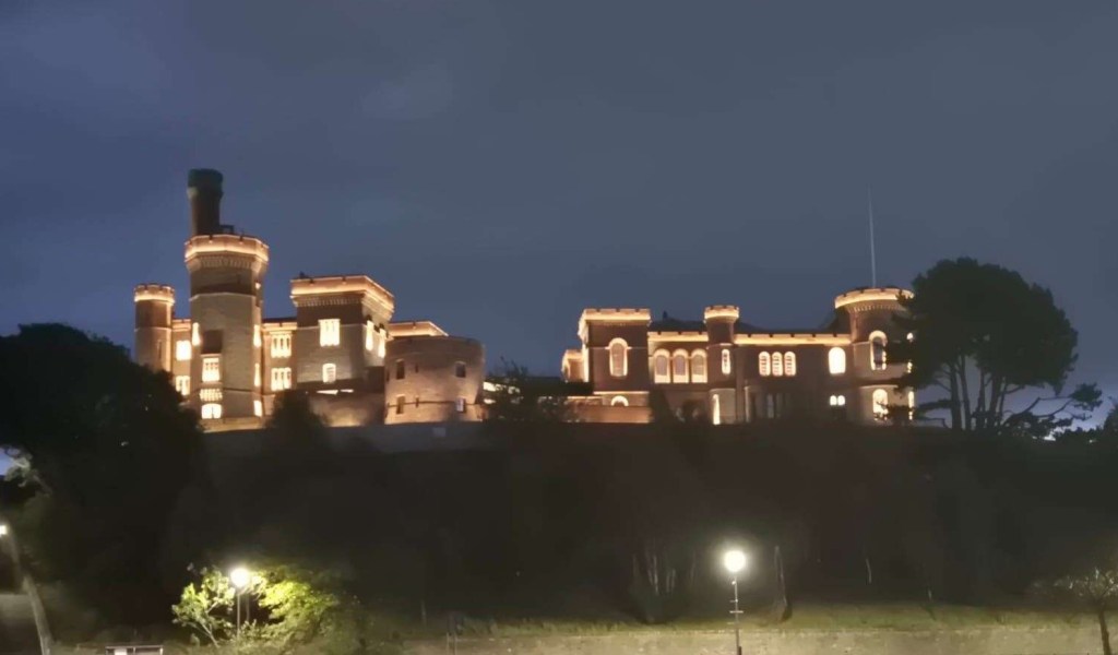 The castle lit up at night